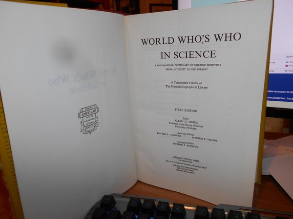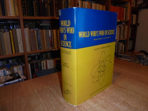 ALLEN G. DEBUS. Chicago, Marquis-Who's Who, 1968. WORLD WHO'S WHO IN SCIENCE From Antiquity to the present. A Bibliographical dictionary of notable scientist from antiquity to te present. In-8° grande, tela bordeaux con titoli in oro sul piano e al dorso, sovracopertina. xvi, 1855 pp. Uff. C - II - 5