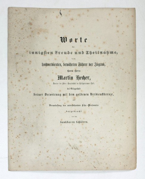 Worte der innigsten Freude und Theilnahme, dem hochverdienten, bewährten Führer der Jugend, Herrn Herrn Martin Hecher, Director der Pfarr-Hauptschule im Heiligenkreuzer-Hofe, bei Gelegenheit Seiner Decorirung mit dem goldenen Verdienstkreuze, auf Veranlassung des unterstehenden Lehr-Personales dargebracht von den dankbaren Schülern.