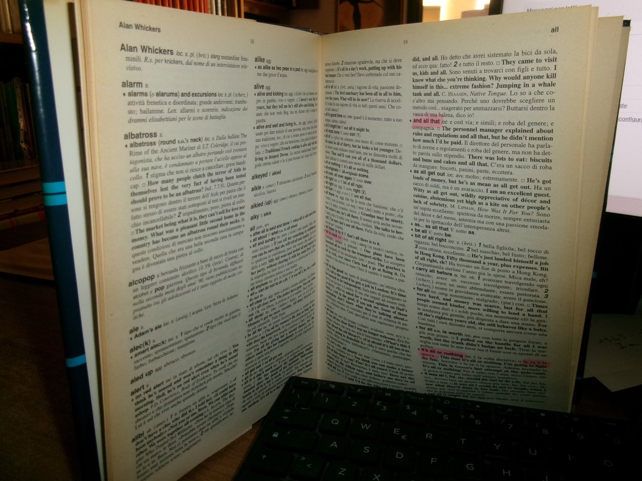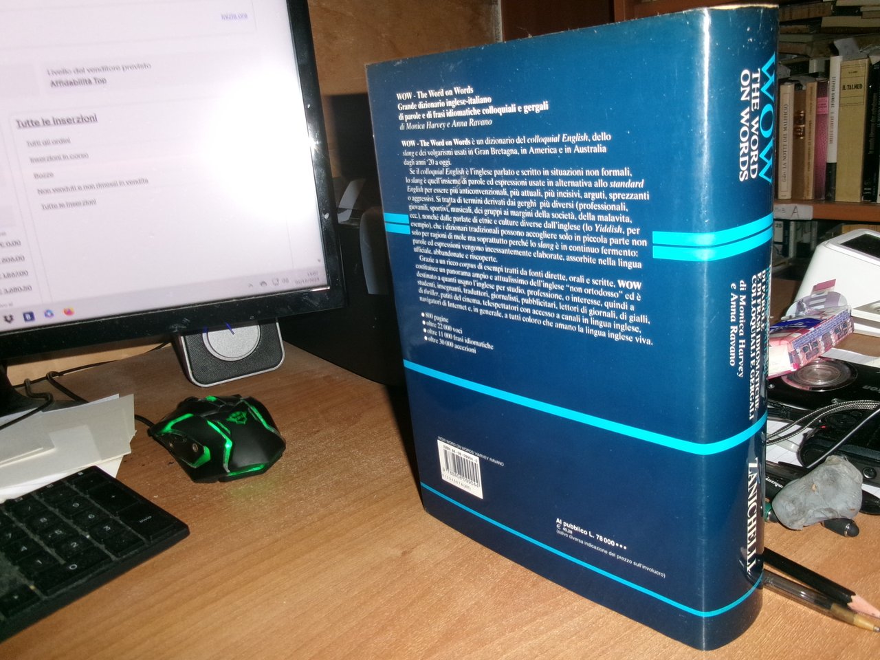 di Monica Harvey e Anna Ravano. Bologna, Zanichelli, 1999. WOW The Word on Words Grande Dizionario Inglese Italiano di parole e di frasi idiomatiche colloquiali e gergali. In-8°, similpelle bleu con sovracopertina. 800 pp. Libro usato con tagli leggermente ingialliti, evidenziature in colore rosa in poche pagine. Neg. mob. 18