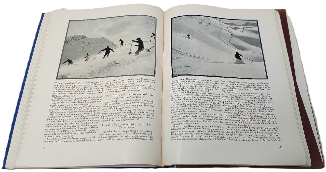 >in-4, pp.218, XXII, tela edit. figurata, titolo al dorso. Seconda edizione (la prima edizione uscì nel 1925), magnificamente illustrata da 242 immagini fotografiche e 162 strisce con 1100 fotogrammi di discese sciistiche conservati in apposito astuccio applicato all'interno del piatto posteriore del volume (l'astuccio è stato rifatto in cartoncino bianco). L'opera uscì anche in francese ed in inglese (Les merveilles du ski, The wonders of ski-ing). Arnold Fanck, regista tedesco studioso di scienze naturali e amante della montagna, aveva diretto nel 1920 in collaborazione con l'etnologo Tauern un film dallo stesso titolo, nel quale unici protagonisti erano lo sci e la montagna: "Prodigi dello sci". Fu il pioniere di questo genere cinematografico, all'epoca di notevole difficoltà tecnica. il film di montagna. Leni Riefenstahl ne rimase affascinata e volle partecipare come attrice al successivo, "La montagna sacra"; Fanck fu il produttore del film "La luce blu" diretto dalla Riefenstahl, che attirò l'attenzione di Adolf Hitler, consacrandola come regista ufficiale del Nazismo, sino al celebre film sulle Olimpiadi di Berlino. Bellissimo volume, di estremo interesse per lo sci e la cinematografia, nelle loro fasi ponieristiche.