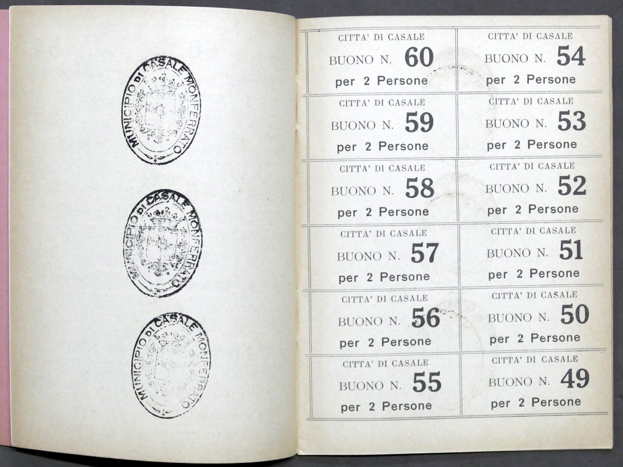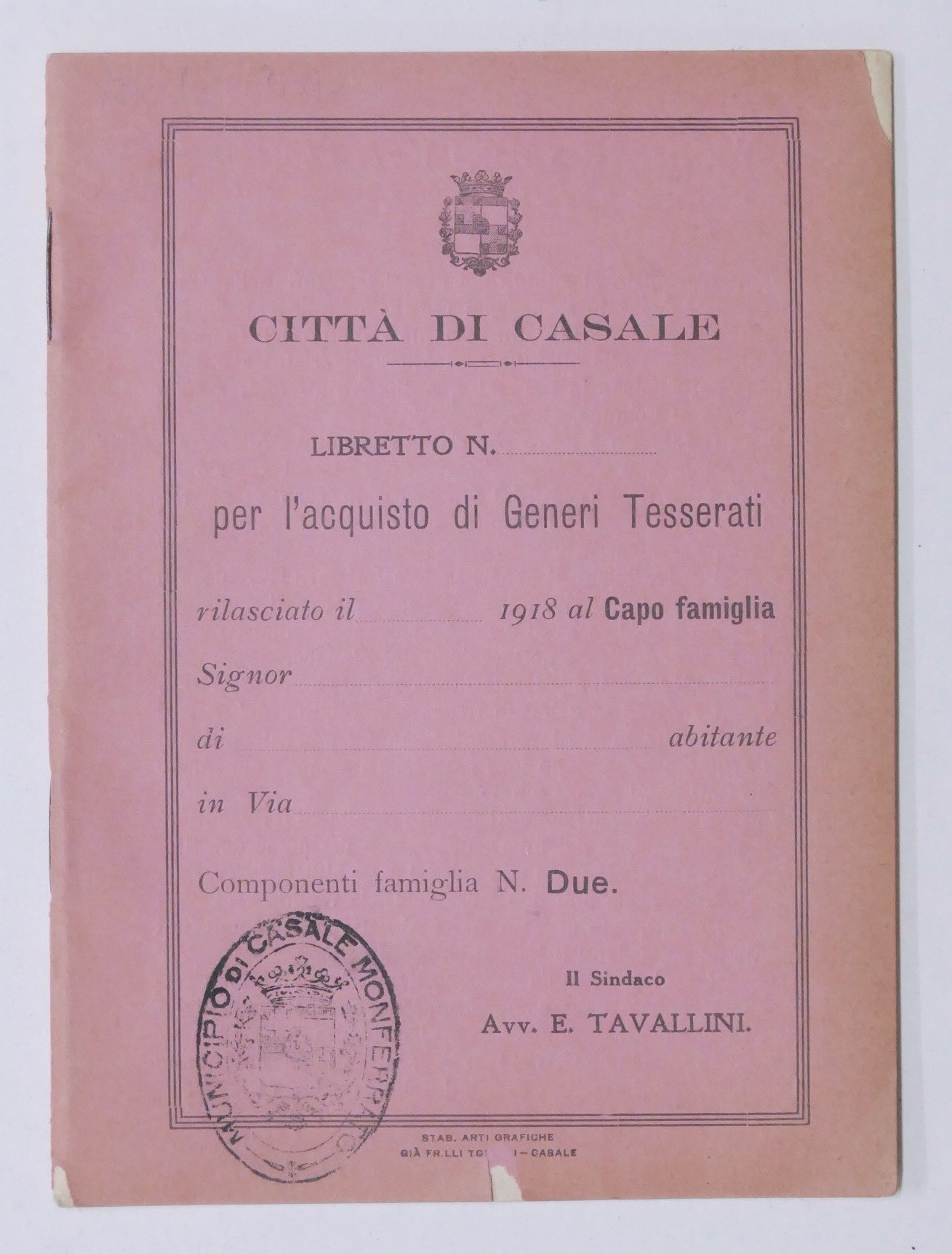 WWI - Città di Casale - Libretto per l'acquisto di Generi Tesserati - 1918