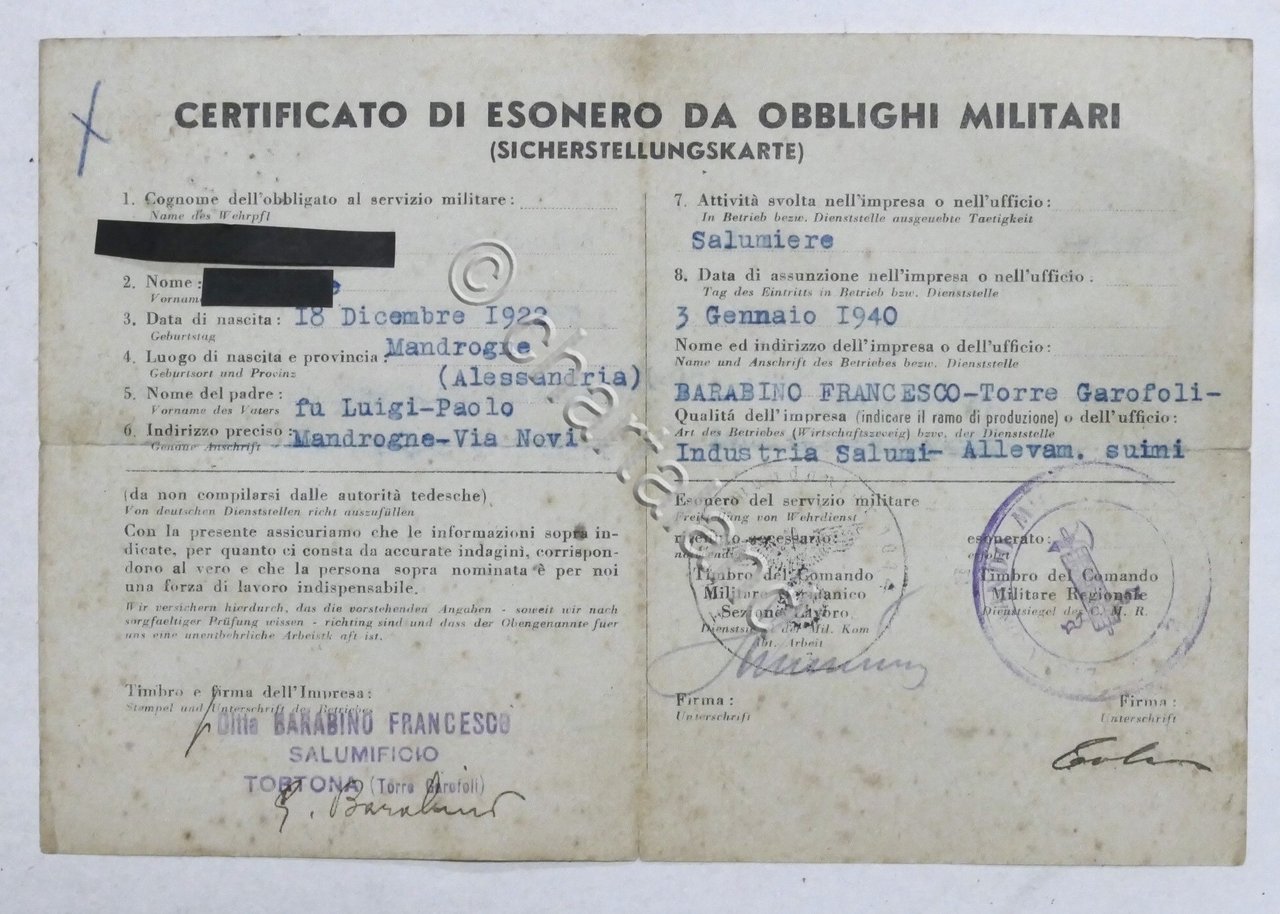 WWII - Certificato di Esonero da Obblighi Militari - 1942 ca.