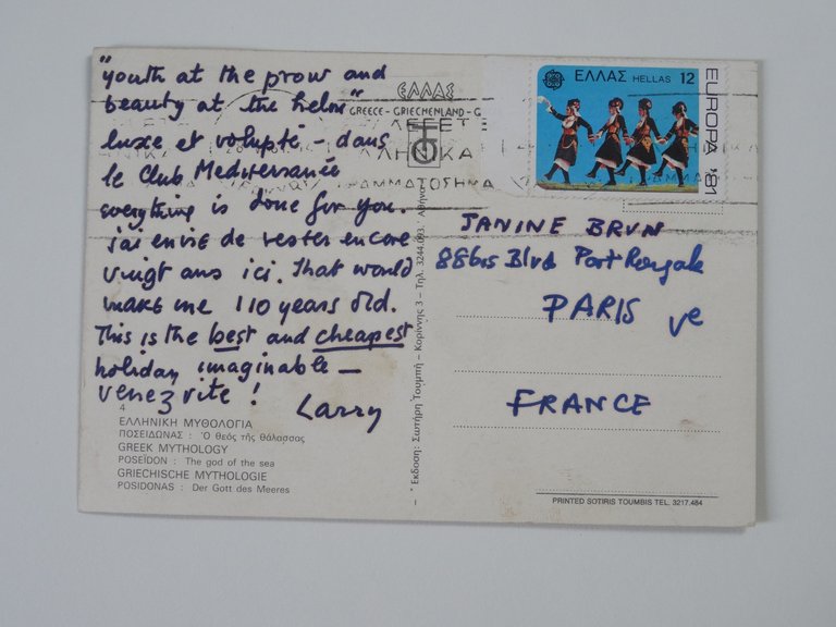 Grèce [Greece] 28 mai 1981 | 14.60 x 10.20 cm | une carte postale | [ENGLISH DESCRIPTION ON DEMAND] | Carte postale autographe signée de Lawrence Durell adressée à Jani Brun, sa jeune amante française, rédigée au feutre bleu, au verso d'une illustration humoristique mettant en scène Poséidon. L'écrivain a séjourné au Club Méditerranée et en chante les louanges par un vers du poème néomédiéval The Bard, de Thomas Gray et un de Baudelaire : youth at the prow and beauty at the helm (Jeunesse à la proue et beauté à la barre) luxe et voupté - dans le Club Méditerranée, everything is done for you (tout est fait pour vous) J'ai envie de rester encore vingt ans ici. That would make me 110 years old (j'aurais 110 ans). Après de nombreuses années passées en Grèce, en Egypte et à Rhodes, l'écrivain voyageur Lawrence Durrell fut contraint de fuir Chypre à la suite de soulèvements populaires qui menèrent l'île à son indépendance de la couronne britannique. Riche seulement d'une chemise et d'une machine à écrire mais auréolé du succès de son roman Bitter Lemons of Cyprus (Les citrons acides), il arriva en 1956 en France et s'établit dans le village languedocien de Sommières. Dans la « maison Tartès », sa grande demeure entourée d'arbres, il écrivit la seconde partie de son œuvre, son monumental Quintette d'Avignon, s'adonna à la peinture et reçut ses illustres amis, dont le couple Henry Miller et Anaïs Nin, le violoniste Yehudi Menuhin, l'éditeur londonien Alan G. Thomas, et ses deux filles Pénélope et Sappho. Parmi les oliviers et sous le soleil méditerranéen, il y rencontre au milieu des années 1960 la jeune et pétillante Jany (Janine Brun), montpelliéraine d'une trentaine d'années à la beauté ravageuse, qui travaillait au département des Antiquités de la Sorbonne à Paris. Elle fut prénommée « Buttons » en souvenir de leur première rencontre, où la jeune fille portait une robe couverte de boutons. Henry Miller tomba également sous le charme de « Buttons », louant sa beauté et son éternelle jeunesse dans d'exceptionnelles lettres restées inédites. Les trois compères passèrent des soirées parisiennes mémorables dont nous gardons de précieuses traces autographes à travers leurs échanges épistolaires. Recommandée par Durrell, elle fit de nombreux voyages notamment en Angleterre d'où elle reçut une vaste correspondance de l'écrivain ainsi que des œuvres d'art originales signées de son pseudonyme d'artiste, Oscar Epfs.