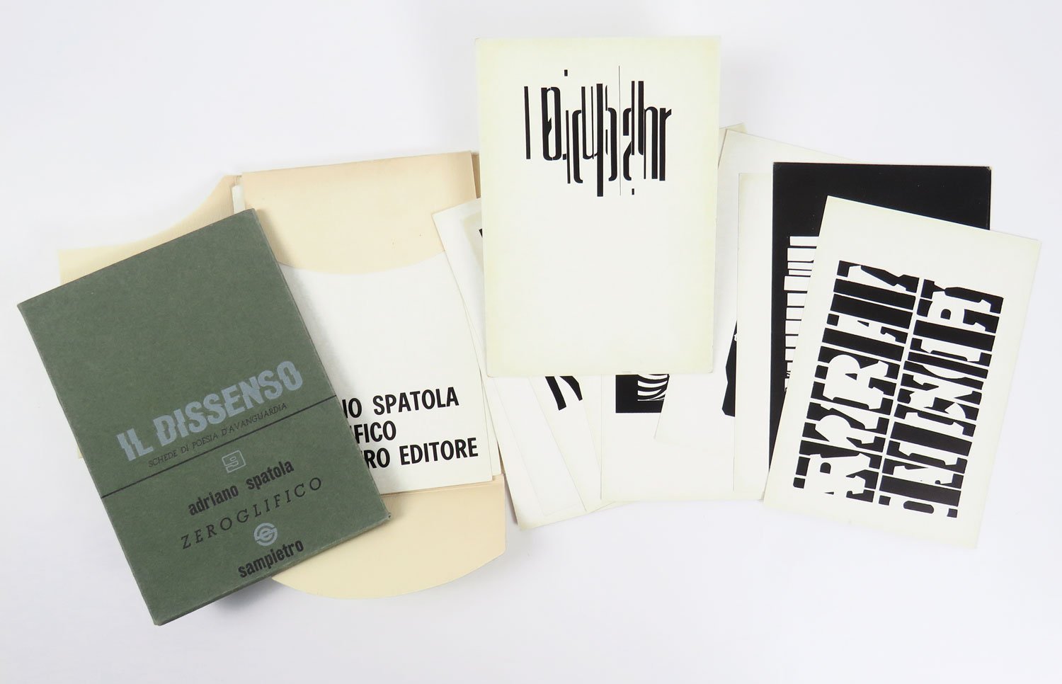 LIBROEdizione originale.Ottimo esemplare, completo in ogni sua parte (appena percettibile lieve ingiallitura perimetrale alle carte); in quarta di copertina etichetta editoriale che annuncia «Questo volume L. 1500 (Iva compresa)».Rara seconda raccolta di poesie visive, ospitata così come la prima («Poesie da montare», 1965) nella collana sperimentale «Il Dissenso», pubblicata dall’editore Sampietro di Bologna — uno dei protagonisti editoriali del periodo della neoavanguardia — per una decina di fascicoli nel corso degli anni sessanta, tutti accomunati dallo stesso, raffinatissimo design ideato dallo studio Cuniberti-Mignani. Se in «Poesia da montare» Spatola era comunque rimasto ancorato alle parole, pur slegate dai tradizionali vincoli testuali ed editoriali, qui financo le singole lettere sono frammentate e decostruite per diventare, appunto, «zeroglifici». L’artista parte dall’assunto paradossale che se «i testi concreti si avvicinano spesso, data la loro dipendenza tipografica, ai testi pubblicitari, deve allora essere in qualche modo verificabile anche il contrario: i testi pubblicitari sono cioè già, almeno tipograficamente, progetti di poesia concreta» (dalla quarta di copertina). Il libro inaugurò una delle vie di Adriano Spatola all’interno della poesia visiva (o concreta che dir si voglia), probabilmente la più originale, coltivata indefessamente fino agli «Ultimi zeroglifici» — appunto — del 1985, a tre anni dalla prematura scomparsa dell’artista. Il primo «Zeroglifico» avrà l’onore di una seconda edizione / anniversario nel 1975, come numero 20 della collana «Poesia» delle Edizioni Geiger, con una prefazione di Giulia Niccolai, poetessa, traduttrice e per un ampio periodo compagna di vita e di lavoro di Adriano Spatola, quindi indefessa redattrice del progetto Geiger in tutte le molteplici sue forme. La seconda edizione sarà prontamente tradotta in inglese due anni dopo da Paul Evangelisti, per i tipi di The Red Hill Press, Los Angeles - Fairfax.Tonini, I libri di Adriano Spatola (2011), n. 3; Fontana, In forma di libro, p. 31; Osti e Minarelli, 3 editori storici d’avanguardia, p. 53 (con illustrazione)
