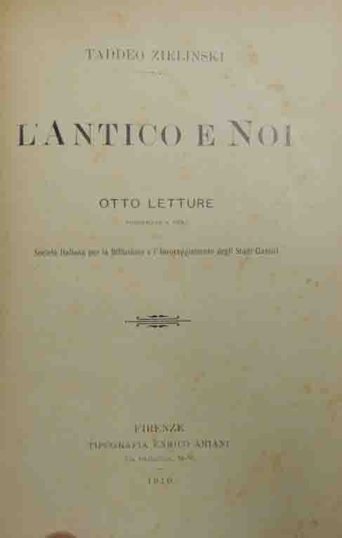 Taddeo Zielinski, L’antico e noi. Otto letture, pubblicate a cura della Società Italiana per la Diffusione e l’Incoraggiamento degli Studi Classici, Tipografia Enrico Ariani, Firenze 1910, pp. V, 163, cm 21, legatura in mezza tela nera con titoli manoscritti al dorso. Segnature di collocazione alla prima pagina, qualche sporadica sottolineatura, fioriture, per il resto molto ben conservato.
