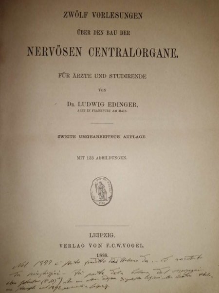 Zweite umgearbeitet Aulfage. Leipzig, F.C.W. Vogel, 1889. Edinger, Ludwing. In-8°, br. (dorso rinforzato) 164 pp. con 133 illustrazioni n.t. Meyer, Historical aspects of cerebral anatomy, p. 53