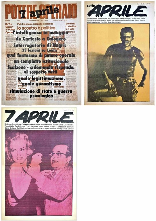 Rara collezione completa di questa rivista pubblicata in relazione all'inchiesta del 7 aprile 1979: quel giorno il sostituto procuratore Calogero emise un ordine di cattura nei confronti di Antonio Negri, Luciano Ferrari Bravo, Emilio Vesce, Oreste Scalzone, Franco Piperno, Pino Nicotri, Nanni Balestrini e altri, con l'accusa di aver diretto e organizzato una banda armata, le Brigate Rosse, e aver diretto e organizzato un'associazione sovversiva chiamata Potere Operaio e altre associazioni riferibili all'Autonomia Operaia. Siamo negli anni ‘70, ricordati mediaticamente come "anni di piombo", le lotte sono radicali e diffuse, non mancano gli omicidi, ricordiamo i più noti: Aldo Moro (maggio ‘78), Guido Rossa (24 gennaio ‘79), il giudice Alessandrini (29 gennaio 79), e la repressione dello Stato passa all'azione. La magistratura ritiene di aver individuato la "cupola" delle organizzazioni armate ed emette ordini di cattura a militanti, docenti universitari ed intellettuali per il solo fatto di aver espresso opinioni o scritto testi teorici "sovversivi". In questo senso l'inchiesta fu una delle operazioni giudiziarie più scandalose del secolo scorso, ritenute un "laboratorio" repressivo che verrà utile negli anni a venire. L'inchiesta si divide in due tronconi, uno padovano e l'altro romano, in quest'ultimo a Toni Negri e al giornalista Giuseppe Nicotri vengono attribuite le telefonate a Eleonora Moro durante il sequestro di Aldo Moro, un'accusa talmente grottesca che all'epoca fece ridere anche i polli, non i magistrati, che usarono le accuse più fantasiose. ("associazione sovversiva" si presta assai - basta un numero di telefono in un agenda - per far scontare agli imputati del 7 aprile anni di carcere preventivo). La collezione completa della rivista è composta da 4 numeri in 3 fascicoli, densi di firme autorevoli che eccedono la cerchia ristretta della militanza e che si espongono con una prospettiva critica e garantista alla vicenda. Una grafica ragionata, sarcastica ed essenziale ne rivela i toni di sfida intellettuale e politica: i détournement alle prime pagine rovesciano la narrazione, e al secondo numero propongono un Berlinguer in assetto da giustiziere, un'immagine molto forte che ben rappresenta la contrapposizione tra Il PCI e il garantismo; all'ultimo numero l'immagine del giudice Achille Gallucci (colui che a Roma aveva rigettato le richieste di scarcerazione avanzate dalla difesa nel luglio '79) in versione glamour. All'interno un ricco apparato iconografico in B/N accompagna con sarcasmo deposizioni dei detenuti in carcerazione preventiva, interrogatori, stralci di testi incriminati, interventi di intellettuali (Foucault, Guattari, Asor Rosa, Chomsky, Moroni, Bonomi, Gianni Sassi), giornalisti (Giorgio Bocca), giuristi e avvocati (Viviani, Spazzali). Hanno collaborato tra gli altri: Balestrini, Berardi Bifo, Bonomi, Curcio, Ferrari-Bravo, Franceschini, Gambino, Del Giudice, Magnaghi, Moroni, Novak, Pace, Piperno, Roth, Scalzone, Verità, Vesce, Viviani, Zagato. In ottimo stato.