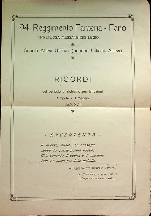 94. Reggimento Fanteria - Fano: scuola allievi ufficiali: ricordi del periodo di richiamo per istruzioni: 3 aprile - 3 maggio 1940 - XVIII. | Rare and modern books |