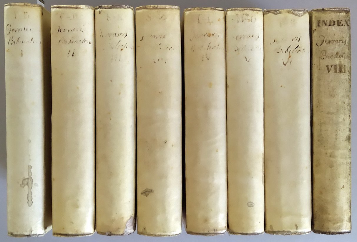 N. 8 vol. in -4 picc. (20 x 24 cm./cad.), legature in pelle pergamena d'epoca, tagli dei fogli rossi, testo in latino su due colonne, pag. XXVIII, 588, (90), 1 ritratto inciso all'acquaforte in antiporta eseguito da J. Zanibelli, frontespizio del 1. volume con testo a 2 colori (nero e rosso), VII, (1), 752, (76), VI, 616, (108), VIII, 694, (2), 103, (1), V, (1), 599, (1), 75, (1), VIII, 782, (2), 117, (1), VIII, 846, (2), 50, XX, 634, (2), 61, (1), Leggere fioriture su alcuni fogli, nel complesso opera in buone condizioni.