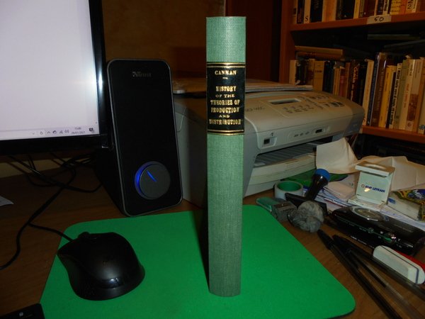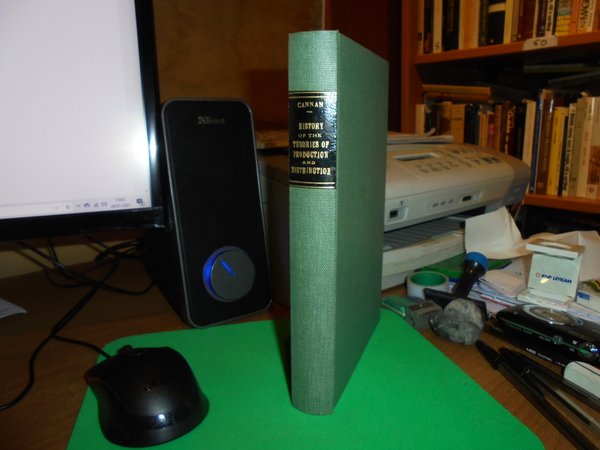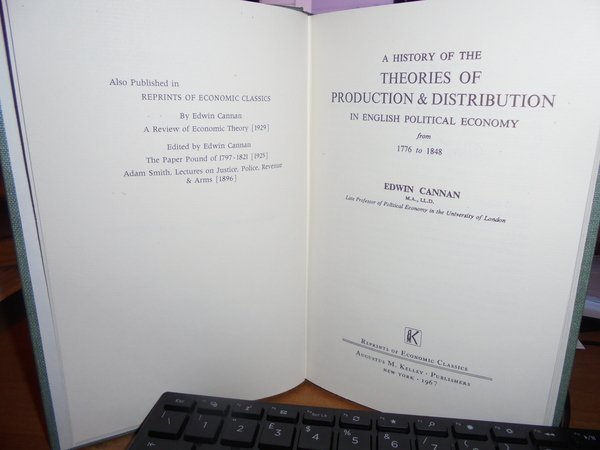 EDWIN CANNAN. New York, Augustus M. Kelley, 1967. A HISTORY of the THEORIES of PRODUCTION & DISTRIBUTION in English Political Economy. In-8° piccolo, tela verde con titolo in oro entro tassello al dorso. xi, 336 pp. Come nuovo. Uff. B - II - 4 - 2