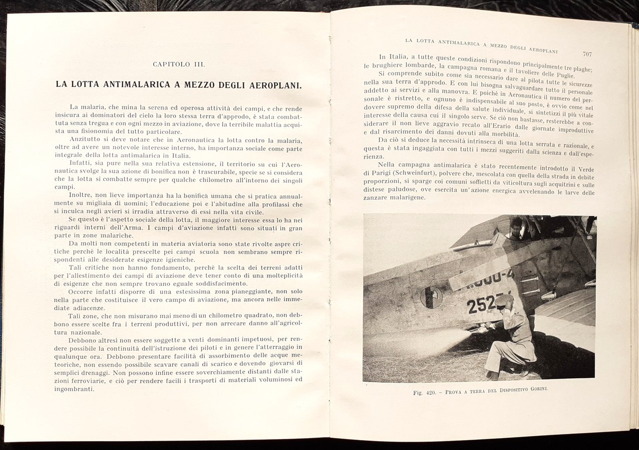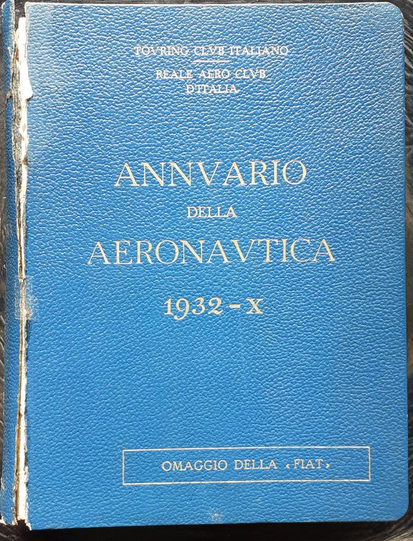 I ed. (March 1932) dell'Annuario della Aeronautica 1932 - Anno X, omaggio della "FIAT". XVI/ 1116/ rilegatura in pelle blu aviazione con titoli dorati. Con illustrazioni in b/n, più di 483 figure, alcune tabelle ed anche immagini a carattere pubblicitario. Sguardie illustrate a colori (FIAT Aviazione). Stato discreto (copertina leggermente usurata e con rottura del canaletto anteriore con coseguente distacco del dorso da questo lato). Indice: Presentazione autografa di S. E. il Generale Italo Balbo - Prefazione; La Direzione Generale del T. C. I. (Milano, narzo 1932 - anno X E. F.) - Evoluzione storica e tecnica dell'Aeronautica (L'aeronautica nella leggenda, nella storia, nella guerra - Aeroplani e Idrovolanti - Stabilità e pilotaggio dei velivoli - Costruzione dei veivoli - Aerostati e dirigibili - Elicotteri e autogiri - Motori a combustione iinterna) - L'organizzazione aeronautica in Italia (Gli orddinamenti aeronautici dal 1915 al 1925 - L'organizzazione centrale - L'organizzazione territoriale) - Le principali organizzazioni aeronautiche nel mondo (Francia, Gran Bretagna, Germania, Giappone, Jugoslavia, Stati Uniti d'America) - L'aeronautica civile (L'aviazione commerciale in Italia - L'aviazione commerciale all'estero-Organizzazione - L'aviazione turistico sportiva) - L'industria aeronautica italiana (Origine, sviluppo, costruzioni) - Aviazione sanitaria e servizio sanitario (L'aviazione sanitaria - Il servizio sanitario nella R. Aeronautica - La lotta antimalarica a mezzo degli aeroplani) - La navigazione aerea (Geografia matematica elementare - Meteorologia ed aerologia - Elementi sulla condotta della navigazione aerea - La navigazione ad alta quota) - La legislazione aeronautica (La discciplina giuridica della navigazione aerea - La legge italiana per l'aeronautica civile - Il registro navale ed aeronautico italiano) - Associazioni e sodalizi aeronautici (Associazioni aeronautiche internazionali - Associazioni aeronautiche italiane - Associazioni aeronautiche estere) - Le grandi imprese aeronautiche (Records internazionali - Le grandi manifestazioni dell'aeronautica italiana - Il giorno dell'ala) - La sicurezza aerea (Norme per la sicurezza aerea) - L'aviazione nel futuro (Perfezionamenti della tecnica costruttiva nel prossimo avvenire) - Fotografia e cartografia aerea (La fotografia aerea - La cartografia aerea) - La radio applicata all'aeronautica (Generalità - La trasmissione e la ricezione radio a bordo - La radio impiegata per la determinazione di una rotta - Altri problemi interessanti la navigazione) - Appendice I. Tabelle statistiche riguardanti l'aeronautica - Appendice II. Pubblicazioni periodiche aeronautiche - Appendicce III. Tabelle di ragguaglio.