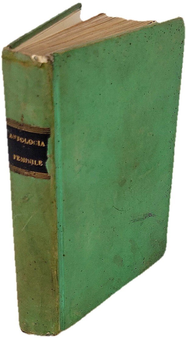 >in-8 piccolo (154x100 mm), pp. 271, frontespizio figurato, occhietto, 4 tavole incise in acciaio f.t. realizzate da Gonin e raffiguranti Cinzica de' Sismondi, Saffo, Elisabetta d'Inghilterra e Caterina II. Legatura coeva in cart. verde, con titolo in oro su tassello al dorso. Prima ed unica pubblicazione di questo progetto editoriale indirizzato alle Donne gentili e chiara prova del valor femminile (cfr. prefazione), il cui obiettivo dichiarato era promuovere il riconoscimento del valore culturale delle donne e sostenere l'importanza della loro educazione e formazione intellettuale. Elegante antologia al femminile che riunisce contributi letterari, sia in versi sia in prosa, di celebri donne di cultura dell'epoca, offrendo uno spaccato significativo della produzione intellettuale femminile. La prima parte raccoglie scritti di numerose autrici italiane, tra cui Isabella Teotochi Albrizzi, Faustina Maratti, Teresa Bandettini Landucci, Diodata Saluzzo Roero e Maria Giuseppa Guacci Nobile, insieme ad altre figure rappresentative della cultura letteraria femminile. Emblematici sono i due scritti di Anna Pepoli che aprono il volume: Della dignità delle donne, e del loro potere nella civile società e In ogni età le donne italiane hanno coltivato le arti e le scienze. La seconda parte amplia l'orizzonte includendo contributi di autrici straniere, tra cui Germaine de Staël e Agathe Sophie Sassernò. La terza sezione è dedicata a ritratti e profili di donne illustri del XVI secolo, redatti da noti intellettuali quali Roberto d'Azeglio, Niccolò Tommaseo e Pier Alessandro Paravia. Bell'esemplare, minimi aloni e macchiette.