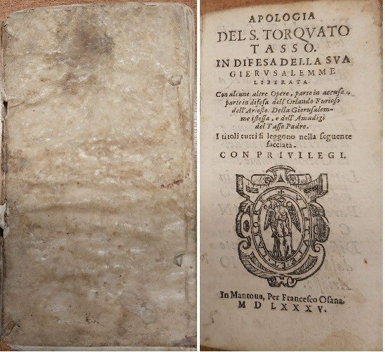 APOLOGIA del S. in difesa della sua Gierusalemme Liberata. Con alcune altre OPere, parte in accusa parte in difesa dell'Orlando Furioso dell'Ariosto. Della Gierusalemme istessa, e dell'Amadigi del Tasso padre. I titoli tutti si leggono nella seguente facciata. Mantova, Osanna, 1585. Unito: Idem. APOLOGIA del S. in difesa della sua Gierusalemme Liberata. | Rare and modern books | Tasso Torquato.