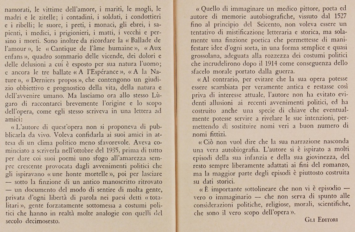 (Codice AN/0384) Due volumi in 4° (28,5 cm) XII+256, 418 pp. Pregevole e unica edizione di 300 esemplari numerati (es. n. 246). Una fiction storico-letteraria: autobiografia di un medico francese del '500, pittore e poeta, viaggiatore presso le corti d'Europa. Il titolo è infatti l'anagramma del nome dell'autore Ernesto Lugaro: psichiatra e neuropatologo, con interessi filosofico-letterari, volle esprimere in tempi di censura il suo pensiero sui problemi della vita, le condizioni dell'umanità e l'avvenire del mondo, ispirandosi liberamente a molti episodi della sua infanzia e giovinezza. L'opera, che avera iniziato a scrivere nell'ottobre 1935, era destinata alla pubblicazione postuma; venne infatti edita "in memoria" da un gruppo di amici. Grandi e bei volumi illustrati con 5 tavole fuori testo, di cui una vera foto. Raffinata edizione, in elegante veste tipografica in caratteri Paganini, composizione a mano, su carta distinta appositamente fabbricata. Elegante legatura tutta tela rossa originale, titolo oro ai piatti, tasselli e titolo oro ai dorsi, tagli superiori colorati, sovraccoperta. Ottimo esemplare, completo dell'opuscolo di presentazione editoriale (4 pp). Una delle opere più curiose del Novecento. ~~~ SPEDIZIONE IN ITALIA SEMPRE TRACCIATA