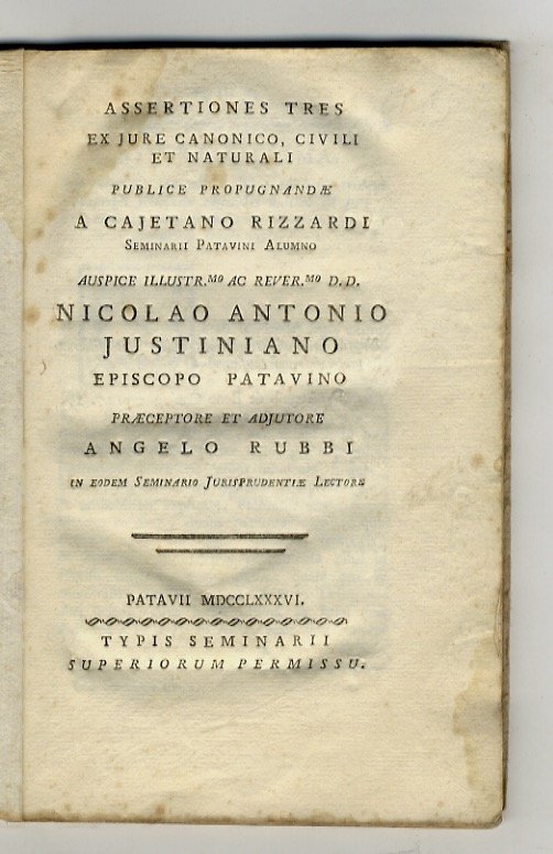 Assertiones tres ex jure canonico, civili et naturali publice propugnandae a Cajetano Rizzardi Seminarii Patavini alumno auspice illustr.mo ac rever.mo D.D. Nicolao Antonio Justiniano episcopo Patavino, praeceptore & adjutore Angelo Rubbi [.].