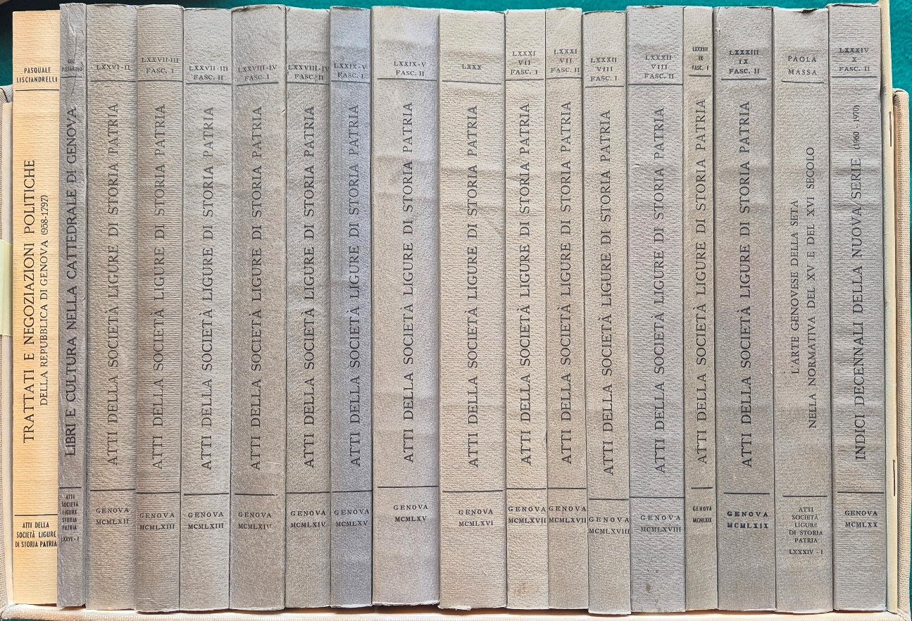 in 8° - pp.200 pp. ca. a vol. - Brossura editoriale con cofanetto - Diciannove volumi in cofanetto - Illustrazioni in b/n fuori testo - Vol I-LXXV della Raccolta: Pasquale Lisciandrelli, Trattati e negoziazioni politiche della Repubblica di Genova (958-1797). Regesti; Vol. II-LXXVI: Geo Pistarino, Libri e cultura nella Cattedrale di Genova tra Medioevo e Rinascimento; Vol. II-LXXVI: Fasc. II; Vol. III-LXXVII: Fasc. I; Vol. III-LXXVII: Fasc. II; Vol. IV-LXXVIII: Fasc. I; Vol. IV-LXXVIII: Fasc. II; Vol. V-LXXIX: Fasc. I; Vol. V-LXXIX: Fasc. II; Vol. VI-LXXX: Fasc. II; Vol. VII-LXXXI: Fasc. I; Vol. VII-LXXXI: Fasc. II; Vol. VIII-LXXXII: Fasc. I; Vol. VIII-LXXXII: Fasc. II; Vol. IX-LXXXIII: Fasc. I; Vol. IX-LXXXIII: Fasc. II; Vol. X-LXXXIV: Fasc. I - Paola Massa, L'arte genovese della seta nella normativa del XV e del XVI secolo; Vol. X-LXXXIV: Fasc. II - Indici decennali della nuova serie (1960-1970); Vol. XIV-LXXXVIII - Appendice - Roberto Lucifredi, Ricordo di Franco Borlandi