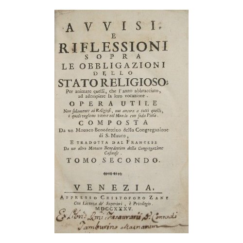 Per animare quelli, che l'anno abbracciato, ad adempiere la loro vocazione. Opera utile non solamente ai Religiosi, ma ancora a tutti quelli i quali vogliono vivere nel Mondo con soda Pietà - Composta da un Monaco Benedettino della Congregazione di S. Mauro, e Tradotta dal francese da un altro Monaco Benedettino della Congregazione Casinese - in 16° - pp.388 - Pergamena - Segni a penna al foglio di guardia, nota di possesso a penna al frontespizio, lievi gore ai margini delle ultime pagine