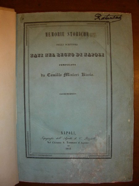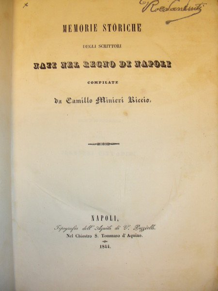 in-8, pp. (10), 467, (2), leg. m. pelle coeva con tass. al d. Comodo indice ragionato dei nomi dei vescovi e arcivescovi. In appendice bella descrizione del duomo di Napoli, del Tesoro, notizie su S. Gennaro e la chiesa di S. Restituta. Manca a Lubrano. Raro.