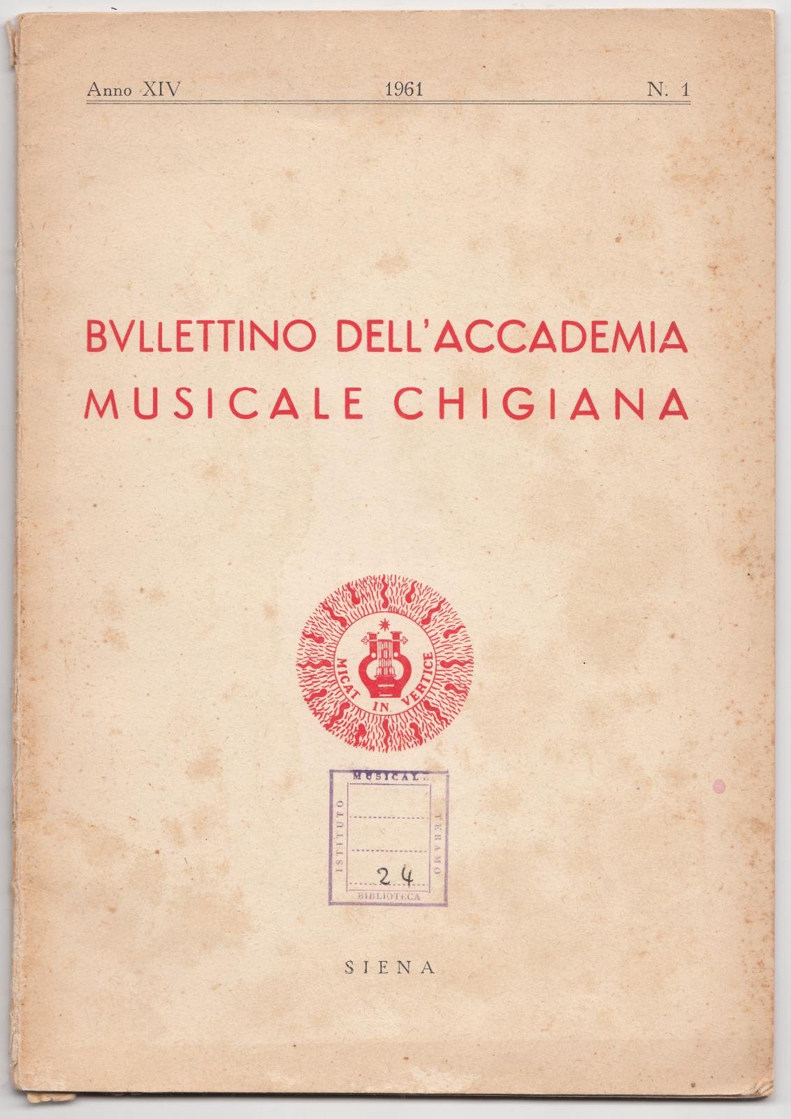 BULLETTINO DELL'ACCADEMIA MUSICALE CHIGIANA ANNO XIV 1961 N. 1 SIENA COPERTINA MORBIDA EDITORIALE CON MACCHIE AI MARGINI E VECCHIO TIMBRO DI CATALOGAZIONE, DORSO CON SPELLATURE E PICCOLE MANCANZE, INTERNO IN BUONO STATO, SEGNI DEL TEMPO, PICCOLE PIEGHE AGLI ANGOLI INFERIORI, ALCUNE FOTOGRAFIE IN B/N N. PAG. 56 CM. 24 X 17