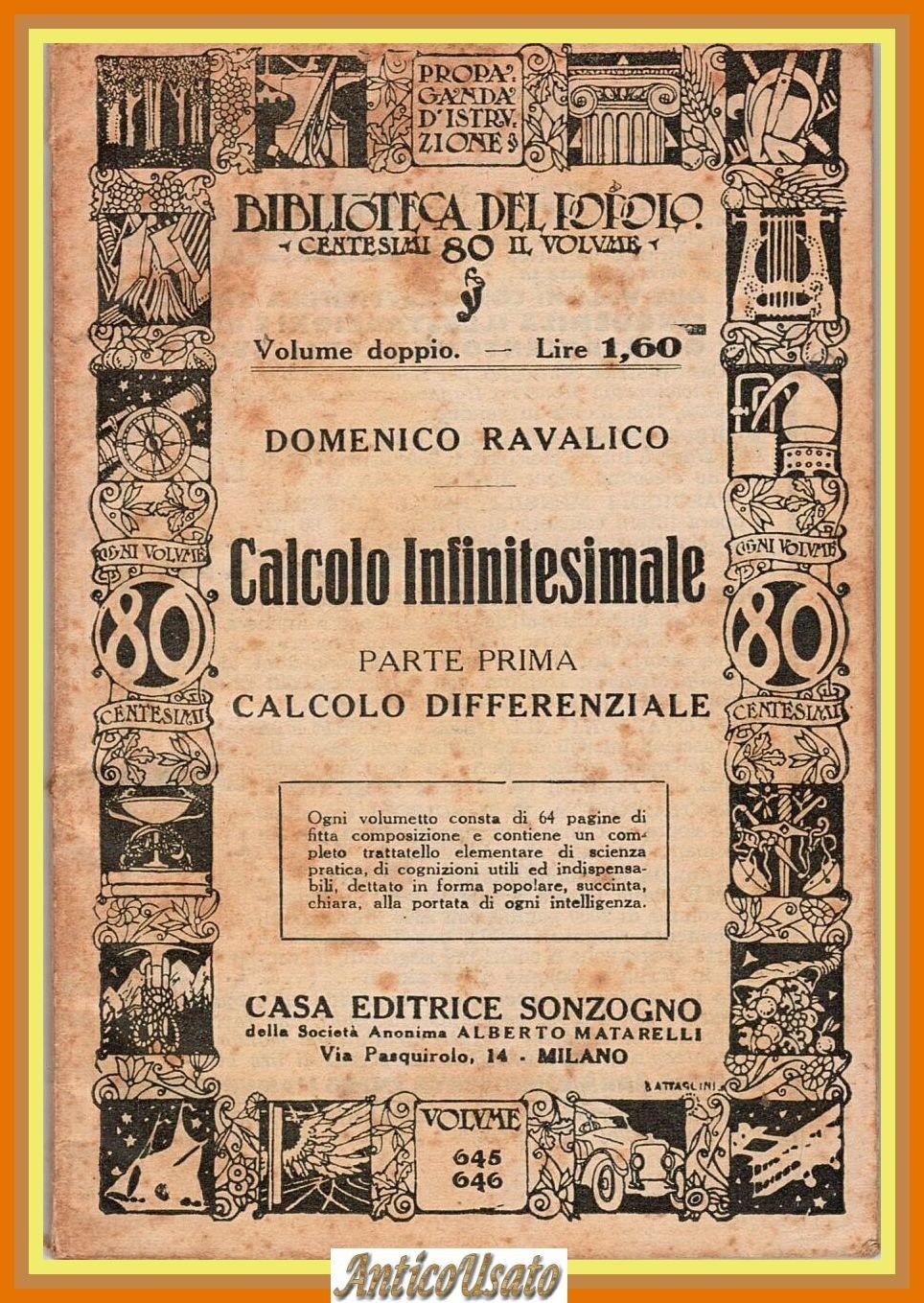 CALCOLO INFINITESIMALE Parte Prima: Calcolo Differenziale di Domenico Ravalico. Casa Editrice Sonzogno Collana Biblioteca del Popolo, volumi 645-646, 1936.121 pagine. Copertina editoriale in brossura illustrata. Stato di conservazione: molto buono (pagine normalmente ingiallite).