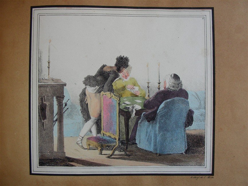 in folio obl. (mm.263x352), 12, leg. m. pelle coeva con angoli, carta. dec. ai piatti e fregi al d. Titolo al piatto ant. Splendido album contenente 12 tavv. numerate inc. in litogr. da C. Motte e colorate a mano, siglate J.J., opera del pittore, ritrattista e miniaturista francese (1767-1855) allievo del pittore neoclassico Jacques Louis David. Raffigurano scene di gusto popolare, importanti anche per la storia del costume e della moda dell'epoca. Mancanza di un paio di cm alle cuffie e una cerniera allentata, ma bell'esempl. fresco e marginoso. Raro. [MM25-474]