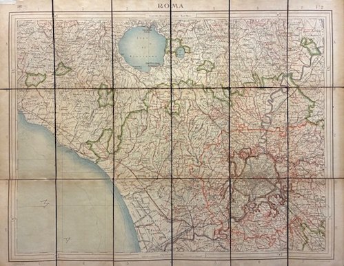 Quattro fogli di cm. 68x87 ciascuno, montati su tela e suddivisi in 18 riquadri, stampati in litografia a colori. Custodia editoriale in tela con etichetta recante il titolo al piatto anteriore. Ex libris manoscritto sull’etichetta (’Proprietà di R. Perrotti’). Ottimo stato di conservazione. Foglio 1: Castel Porziano; Foglio 2: Roma; Foglio 3: Lunghezza; Foglio 4: Campomorto. Rara. Come l’autore stesso precisava nella sua introduzione alla Nuova Carta dell’Agro Romano del 1914, l’Agro era già fornito sin dall’inizio del Settecento di una serie di carte, fra le quali quella del Cingolani del 1692, quella del Nicolai del 1801 e quella della Congregazione del Censo del 1863. Si sentiva però la necessità di una carta che fosse costruita con nuovi criteri, che consistevano nel basarsi su un fondo rappresentato dalla Carta topografica d’Italia con scala 1:100.000 dell’Istituto Geografico Militare di Firenze, ingrandita a 1:75.000 e nel riportare sulla stessa carta ‘i nuovi fabbricati sorti per effetto delle più recenti leggi di bonifica’, i confini delle tenute, i confini dei comuni. L’elenco delle denominazioni delle Tenute con le rispettive superfici e dei nomi dei proprietari completa il lavoro e lo rende comparabile con le liste di casali di epoca precedente. Il rilievo di quest’opera non è solo di carattere storico-topografico, ma anche di carattere storico-economico e storico-sociale. Essa, infatti, permette di verificare quanto ai primi del sec. XX fosse consistente ed estesa la proprietà delle grandi famiglie dell’aristocrazia romana e laziale e quale peso avessero assunto nuove famiglie, tra le quali quelle dei mercanti di campagna del Lazio, che avevano acquistato terre sia da famiglie nobili, sia dalla liquidazione dell’Asse ecclesiastico.