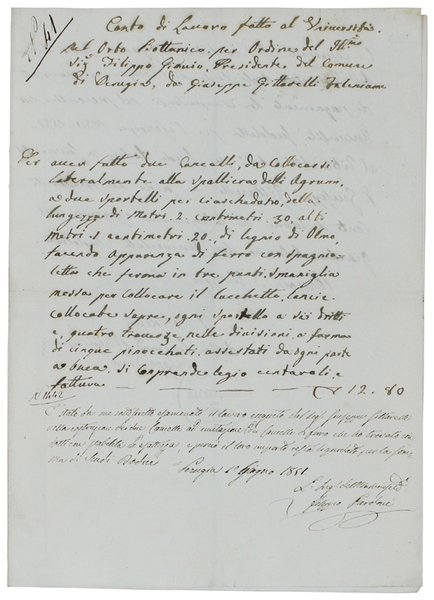 CARTA DI LAVORO FATTA AL UNIVERSITA' NEL ORTO BOTTANICO PER ORDINE DEL ILL.MO SIG. FILIPPO GIOVIO, PRESIDENTE DEL COMUNE DI PERUGIA, DA GIUSEPPE GITTADELLI FALENIAME.