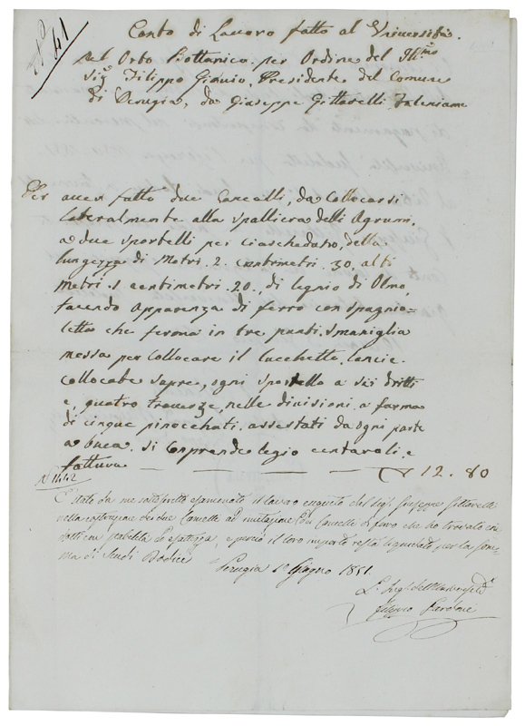 CARTA DI LAVORO FATTA AL UNIVERSITA' NEL ORTO BOTTANICO PER ORDINE DEL ILL.MO SIG. FILIPPO GIOVIO, PRESIDENTE DEL COMUNE DI PERUGIA, DA GIUSEPPE GITTADELLI FALENIAME. | Rare and modern books |