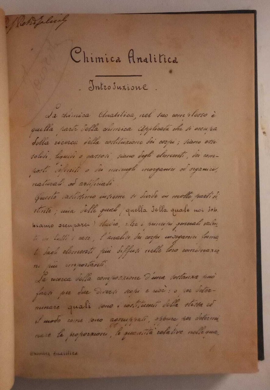 Appunti di chimica analitica. Non è espresso nè il Professore, nè gli allievi che li hanno raccolti, nè l'anno accademico. La copertina rigida artigianale presenta usuali tracce d'uso ai piatti, le pagine risultano brunite, sulle prime tracce di fioriture ma tutte perfettamente fruibili. Volume dismesso da biblioteca privata. 283 Buono (Good) .
