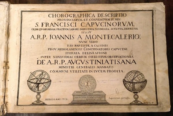Album in-4 oblungo, pp. (2), 9, (2); ff 62; grande titolo inciso con un globo terrestre ed una sfera armillare, una grande carta dell'Europa (mm 500x670) e 61 carte geografiche. Legatura coeva piena pergamena rigida e dorso a nervi. Le mappe mostrano tutti i conventi cappuccini mediante una città murata, il cui campanile è sormontato da una croce o altro simbolo in base all'importanza della sede; sono arricchite da cartigli con mascheroni, putti, strumenti, cornucopie, simboli, oltre che navi nel mare. Ogni tavola è preceduta da un foglio entro larga bordura ornamentale, esplicativo della tipologia e del numero di sedi e di frati presenti in quel territorio.