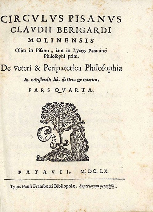 Circulus Pisanus Claudii Berigardi Molinensis olim in Pisano, jam in Lyceo Patavino philosophi prim. De veteri et peripatetica philosophia in Aristotelis libros octo Physicorum. Quatuor de coelo. Duos de ortu & interitu. Quatuor de meteoris, & tres de anima [...] Opus in hac secunda editione auctius & retractatius