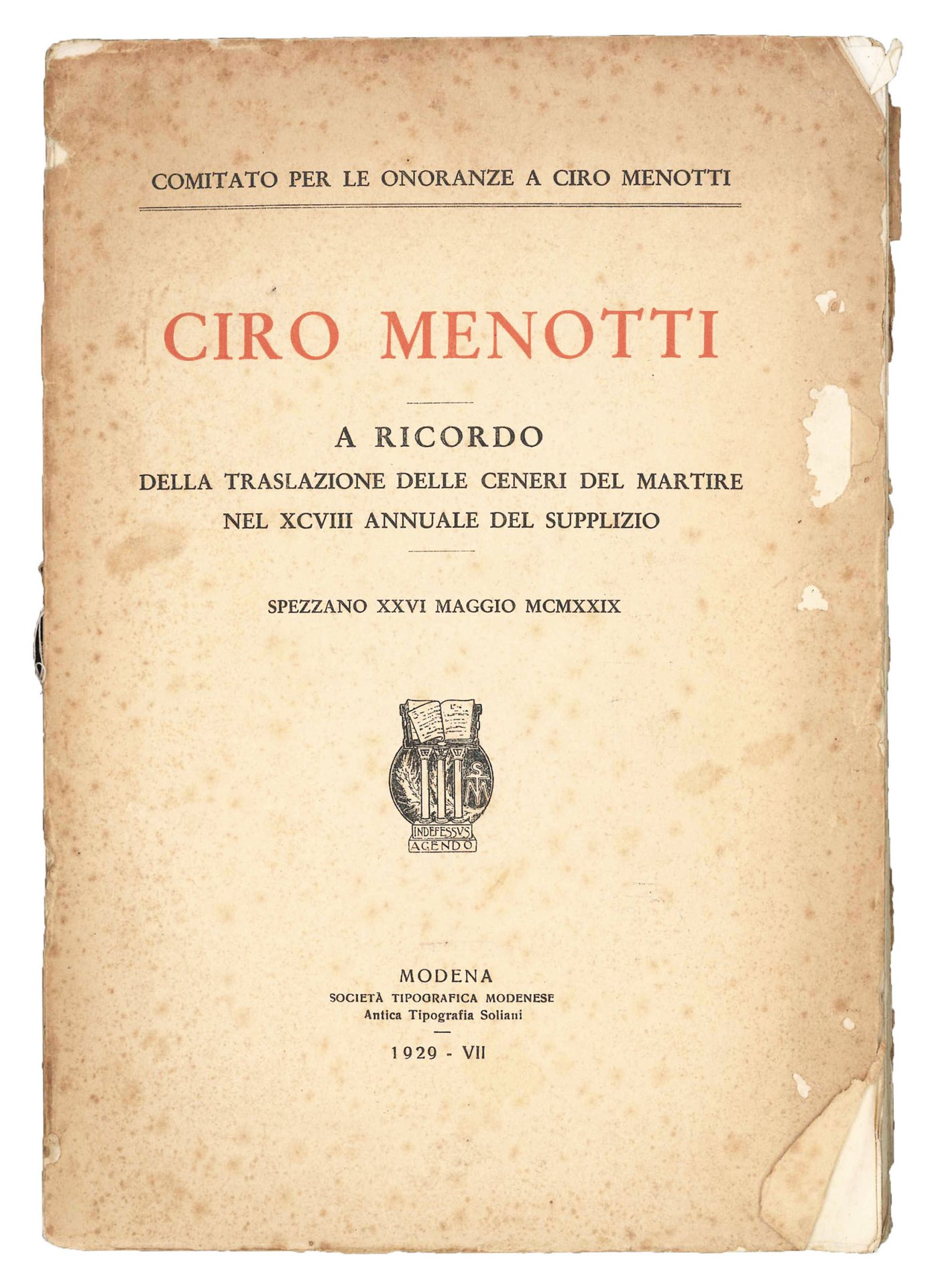 Ciro Menotti : a ricordo della traslazione delle ceneri del martire nel XCVIII annuale del supplizio. Spezzano, 26 maggio 1929. | Rare and modern books | CIRO MENOTTI