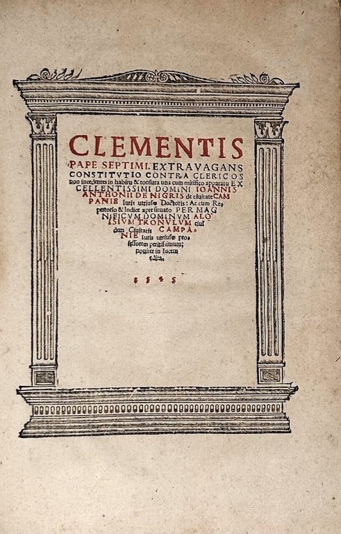Clementis Pape septimi extrauagans constitutio contra clericos non incedentes in habitu & tonsura una cum ... apparatu ... Ioannis Anthonii de Nigris ... Ac cum Repertorio & Indice ... per Aloisium Tronulum ... in lucem edita | Rare and modern books | DE NIGRIS, Giovanni Antonio