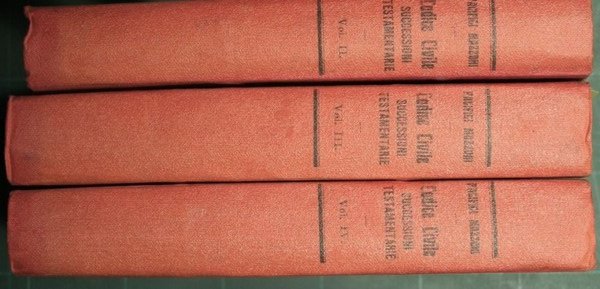 Commentato con la legge romana, le sentenze dei dottori e la giurisprudenza - Seconda edizione riveduta e corredata della giurisprudenza posteriore alla prima - Collana Codice civile italiano commentato. Nn. 6-7-8 - in 8° - pp.497 + XII; 520; 524 - Mezza tela - Tre volumi