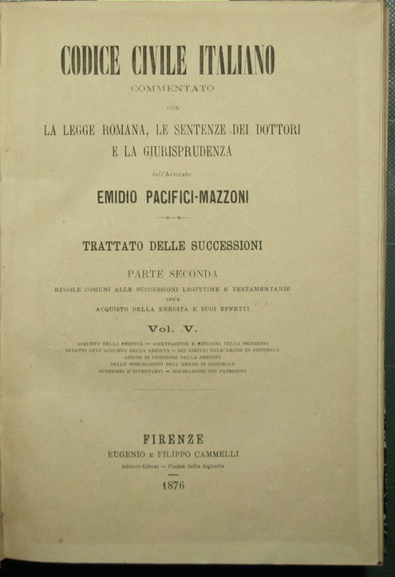 Commentato con la legge romana, le sentenze dei dottori e la giurisprudenza - Parte seconda: Regole comuni alle successioni legittime e testamentarie ossia acquisto della eredità e suoi effetti - Collana Codice civile italiano commentato. N. 9 - in 8° - pp.528 - Mezza tela - Vol. V: Acquisto della eredità. Accettazione e rinunzia della medesima. Effetti dell'acquisto della eredità. Dei diritti dell'erede in generale. Azione di petizione della eredità. Delle obbligazioni dell'erede in generale. Benefizio d'inventario. Separazione dei patrimoni