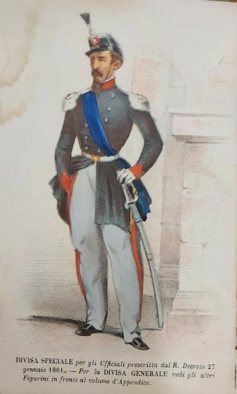 in-8, pp. XIII, 525, leg. m. pelle coeva con tit. e fregi oro al d. Con due tavv. litogr. con bella coloritura coeva raff. la divisa completa della guardia nazionale e particolari della stessa: alamari, mostrine, gradi, fermagli, onoreficenze, distintivi, spalline, pennacchi, keppi, galloni, colletti. Abrasione alla cop. post. raro. Marchetti 765. Manca a CLIO che registra altro titolo.