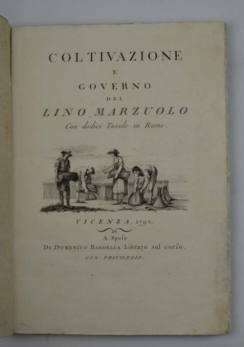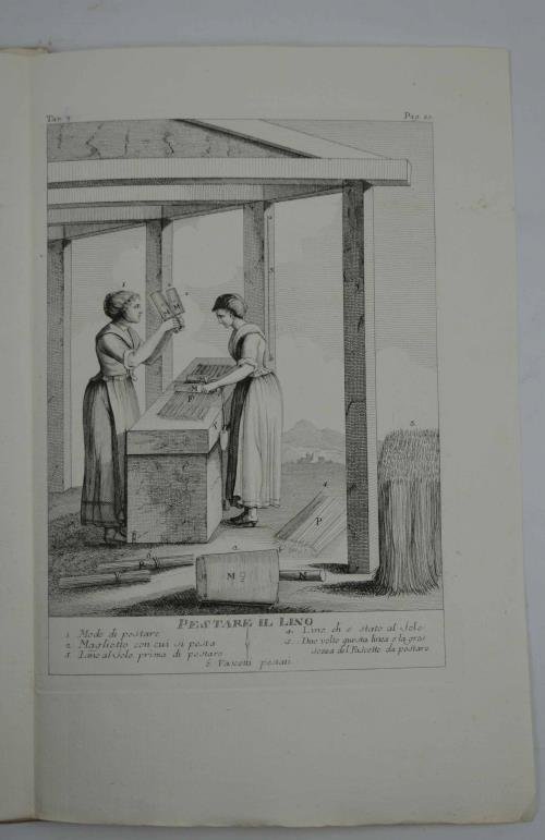 Cm. 31, pp. (2) viii, 80. Bel frontespizio figurato e 12 tavole incise in rame e ripiegate fuori testo. Legatura strettamente coeva in cartonato ricoperto di bella carta dipinta. Bell'esemplare, marginoso ed a carte candide. Elegante pubblicazione che illustra i momenti della coltivazione, del raccolto e della lavorazione del lino. Libro certamente non raro, ma affascinante ed assai elogiato dalle bibliografie specializzate. Cfr. Re (Libri d'agricoltura) iv, p. 154).