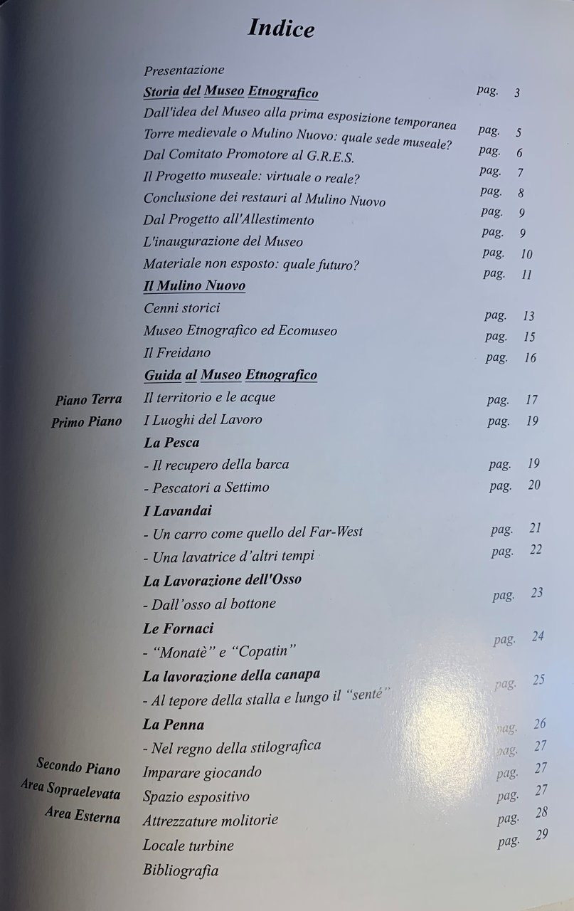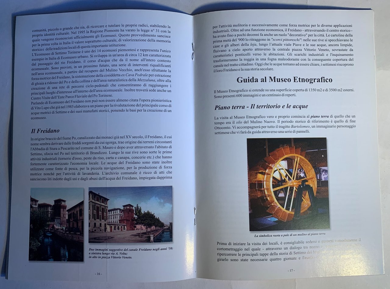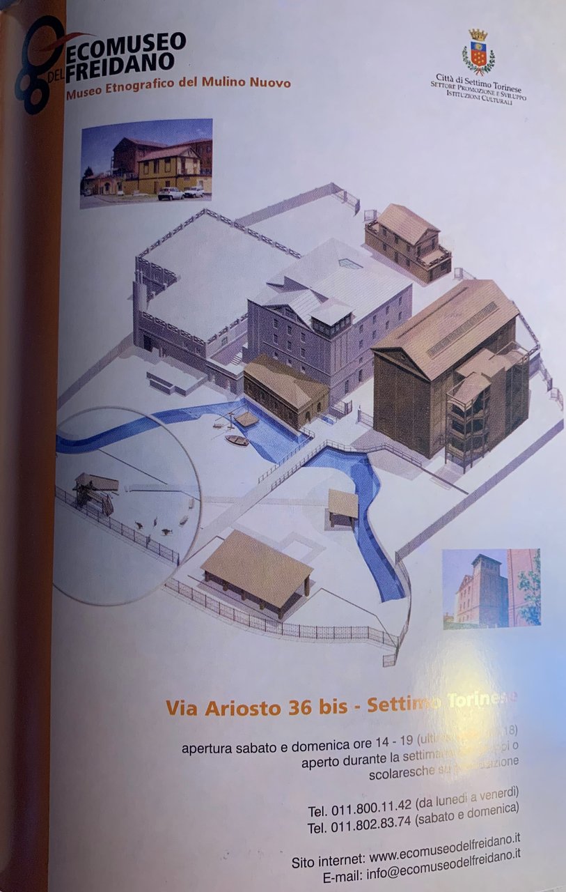 ed.: giugno 2003. Volume n^ 1 della collana "Quaderni del G.R.E.S." a cura del Gruppo Ricerche Etnografiche Settimesi (Via Ludovico Ariosto, 36 bis, Settimo Torinese-TO). Ideazione e testi di Paolo Silvetti. VIII/ 32/ brossura in cartoncino bianco patinato con grafica in arancione, nero, bianco e a colori (Al primo piatto piccola veduta in nero e disegno a colori di Giulio Boccaccio realizzato su commissione del G.R.E.S. nel 1999 e riprodotto su cartolina-ricordo in occasione dell'inaugurazione del Museo Etnografico del 5 ottobre 2002. Al terzo piatto una prospettiva a colori del complesso dell'Ecomuseo del Freidano Museo Etnografico del Mulino Nuovo. All'ultimo piatto una piccola veduta assonometrica a colori del Museo Etnografico del Mullino Nuovo). Illustrazioni in b/n e a colori nel testo e f.t.. Disegni di G. Boccaccio. Fotografie e Immagini di P. Aragno, R. Franceschin, F. Lovera, P. Silvetti, S. Venturini e Città di Settimo T.se - Settore Promozione e Sviluppo Istituzioni Culturali. Stato buono.