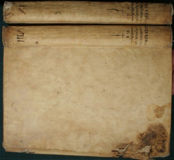 R.P.F. Joannis da Sylveira Ulyssiponensis Carmelitae Regularis Observantiae, Sacrae Theologiae Primarii Lectoris Jubilati - In folio - pp.pp 22 + 462; pp 18nn.+ 484 - Pergamena - Due volumi - Testatine, finalini e capilettere - Testo su due colonne - Alone e mancanza al piatto superiore del primo volume, fioriture e forellini in qualche pagina neza perdita di testo. False pieghe alla pergamena di entrambi i volumi - Vol. I: Tomus primus; Vol. II: Tomus secundus. In quo multa tractantur de Sacrosancta Eucharistia, de Beatissima Virgine Maria, ac duodecim Apostolis