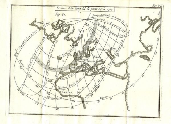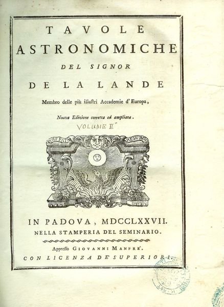 In - 4°. Pagine IV, 254, 10 carte di tavole ripiegate Rilegatura in mezza pergamena con titolo in oro su tassello al dorso. Lievi fioriture. Stato di conservazione molto buono. Manca il primo volume. Rara edizione originale italiana di questa opera d'astronomia del De La Lande tradotta dal Toaldo. Questo secondo volume, il più ricercato, contiene le tabelle per i calcoli astronomici e soprattutto le dieci tavole incise più volte ripiegate contenenti figure geometriche, strumenti astronomici ecc.