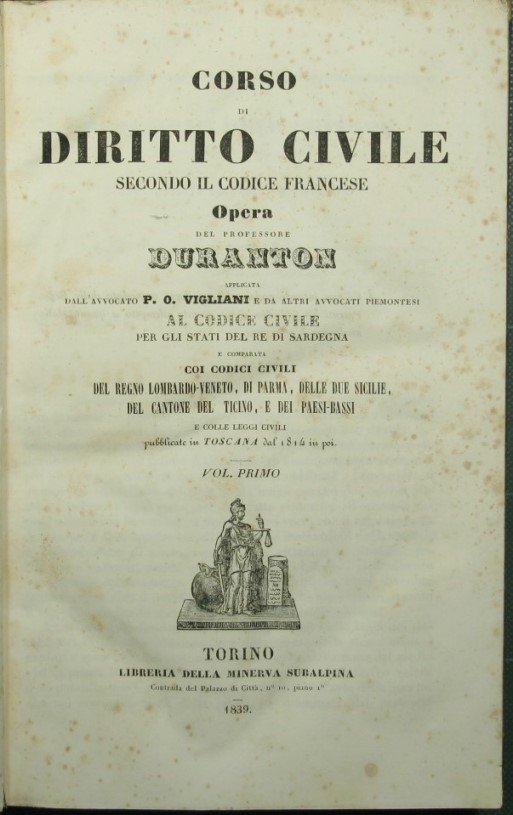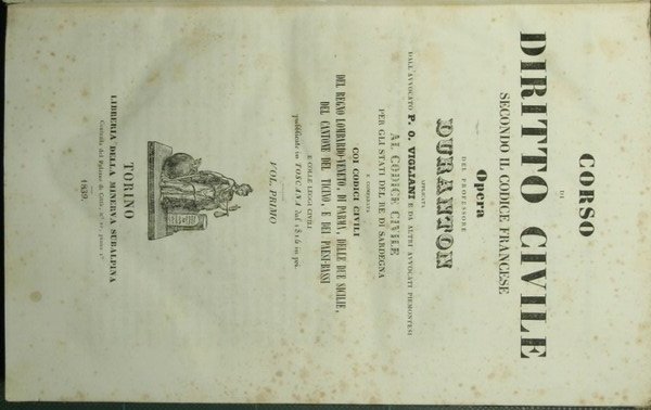 Opera del professore Duranton applicata dall'avvocato P.O. Vigliani e da altri avvocati piemontesi al Codice civile per gli Stati del Re di Sardegna - in 8° - pp.XVI + 587; 639; 549; 730; 848; 551; 715; 616; 700; 621; 680; 847 - Mezza pelle con titolo e fregi in oro al dorso - Dodici volumi - Testo su due colonne. Tagli spruzzati - Fioriture sparse - Comparata coi Codici civili del Regno Lombardo-Veneto, di Parma, delle Due Sicilie, del Cantone del Ticino e dei Paesi Bassi e colle leggi civili pubblicate in Toscana dal 1814 in poi