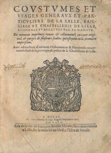 Coustumes et usages généraux et particuliers de La Salle, Baillage et Chastellenie de Lille, confirmez et decretez par sa Majesté. De nouveau imprimez reveus et collationnez au cayer original et purgez de plusieurs fautes qui estoyent en la première impression. Avec adionction d'aulcunes Ordonnances et Mandemes concernans le faict de la practique et police de la Chastellenie de Lille