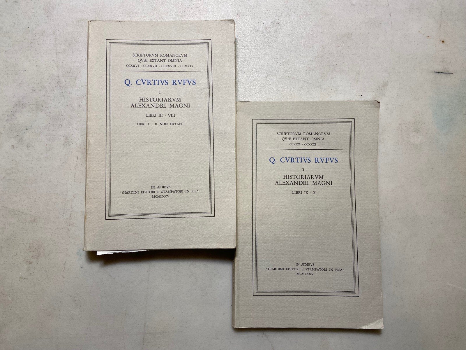 Q. Curtius RufusHISTORIARUM ALEXANDRI MAGNI Giardini editori e stampatori in Pisa, Pisa, 1975Lingua: latinoBrossura, 22,5x14,4 cmSCRIPTORUM ROMANORUM QUAE EXTANT OMNIAPeso: 755 g.I. HISTORIARUM ALEXANDRI MAGNI (LIBRI III-VIII_LIBRI; I, II NON EXTANT)II. HISTORIARUM ALEXANDRI MAGNI (LIBRI IX-X)cod 3041CONDIZIONI DEL LIBRO: Molto buone, l’interno è ottimo.Le pagine all’interno sono leggermente ingiallite.Presenti all’interno dei segni a matita. Piccole ammaccature sulla costa.