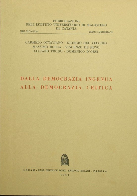 Collana Pubblicazioni dell'Istituto Universitario di Magistero di Catania. Serie filosofica. Saggi e monografie. N. 25 - in 8° - pp.174 - Brossura editoriale - Carmelo Ottaviano - Giorgio Del Vecchio - Massimo Rocca - Vincenzo De Ruvo - Luciano Trudu - Domenico D'Orsi