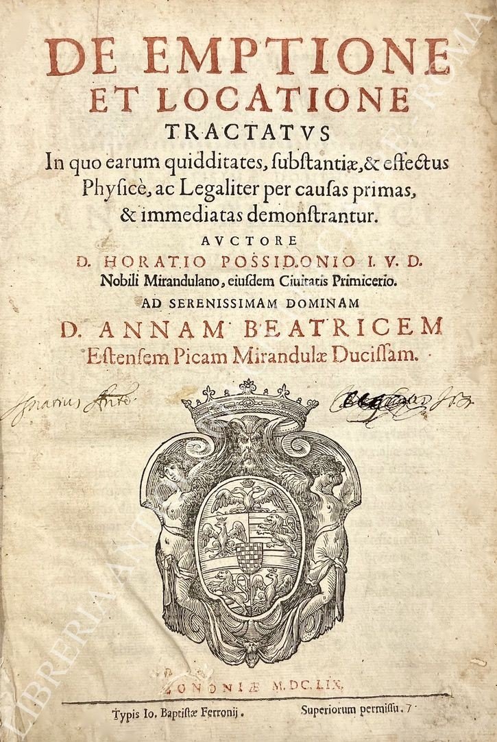 De emptione et locatione. Tractatus In quo earum quidditates, substantiae, & effectus Physicè, ac Legaliter per causas primas, & immediatas demonstrantur. Auctore D. Horatio Possidonio I.V.D. Nobili Mirandulano, eiusdem Ciuitatis Primicerio. Ad serenissimam dominam D. Annam Beatricem Estensem Picam Mirandulae Ducissam | Rare and modern books | Possidonio Horatio - Possidori Orazio