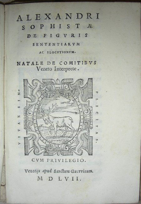 DE ORATIONE sive de modo dicendi. Natale de Comitibus Veneto interprete. Venezia, apud Sanctum Guerrinum, 1557. Unito: ALESSANDRO SOFISTA. DE FIGURIS SENTENTIARUM ac elocutionum. Natale de Comitibus Veneto interprete.