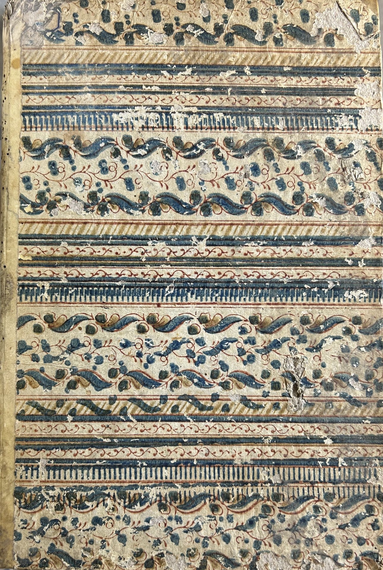 - Antiche tracce di passaggio di tarlo estinto al dorso, ai contropiatti e lungo il margine di alcune carte, chiaro alone alla parte superiore del volume, antica nota cassata al frontespizio