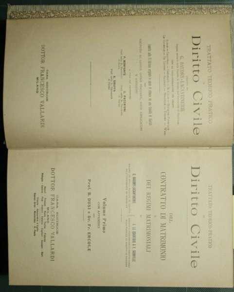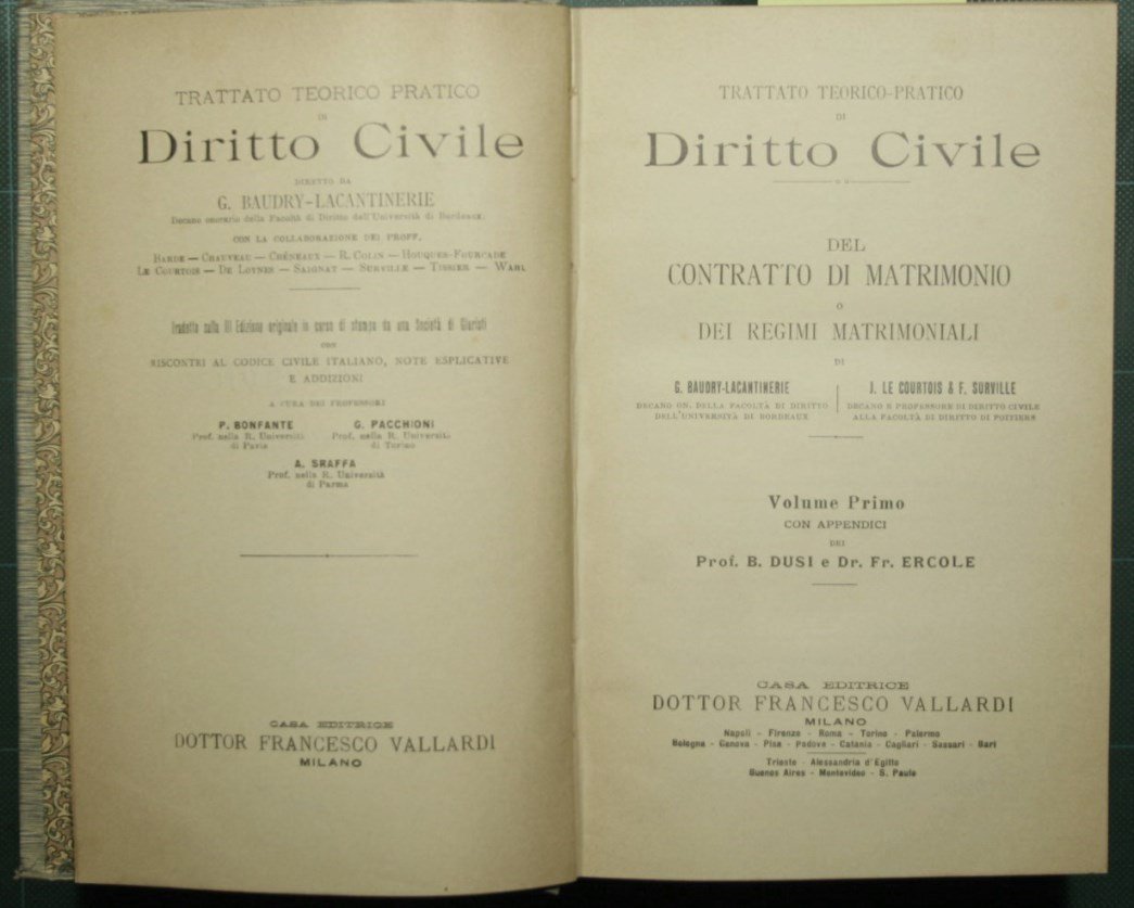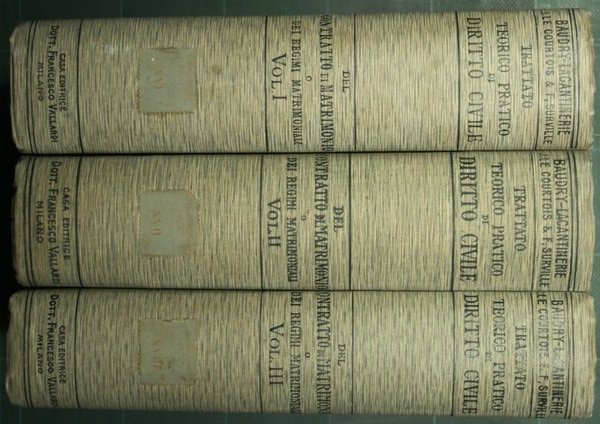 Con appendici dei Prof. B. Dusi e Dr. Fr. Ercole - Collana Trattato teorico-pratico di diritto civile diretto da G. Baudry-Lacantinerie - in 8° - pp.XX + 935; XXVIII + 956 +XXXVII + 812 - Tela editoriale - Tre volumi