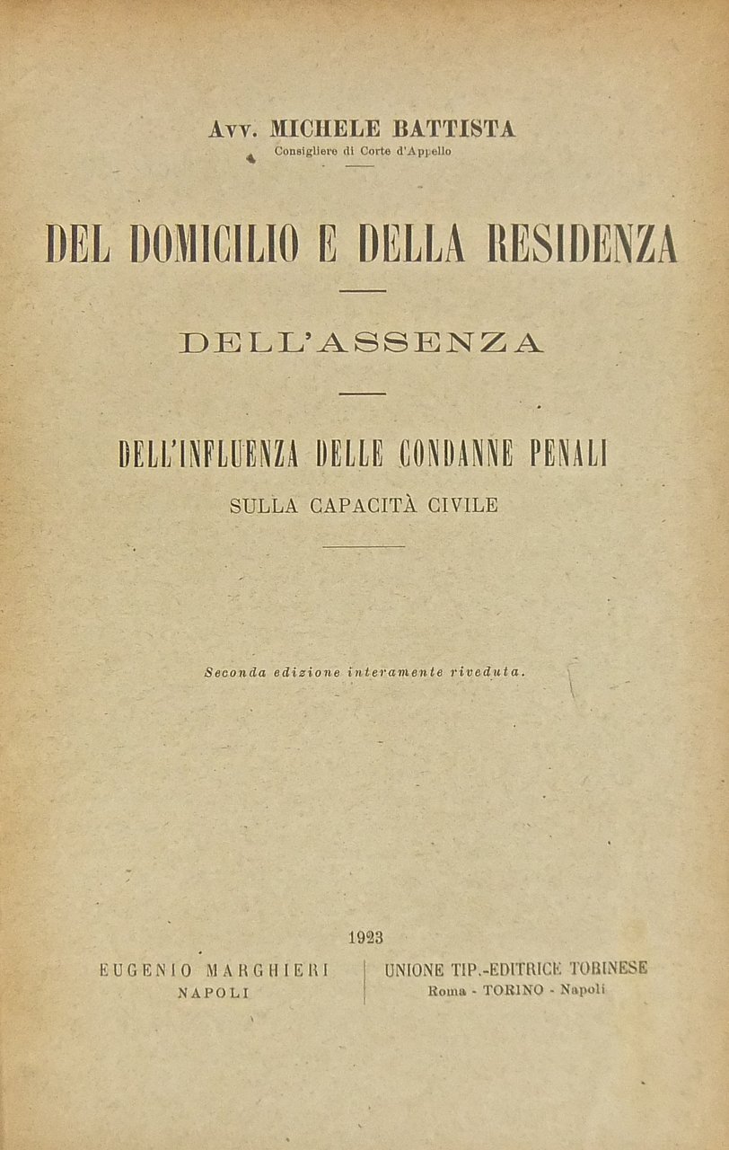 Del domicilio e della residenza. Dell'assenza. Dell'influenza delle condanne penali sulla capacità civile | Rare and modern books | Battista Michele
