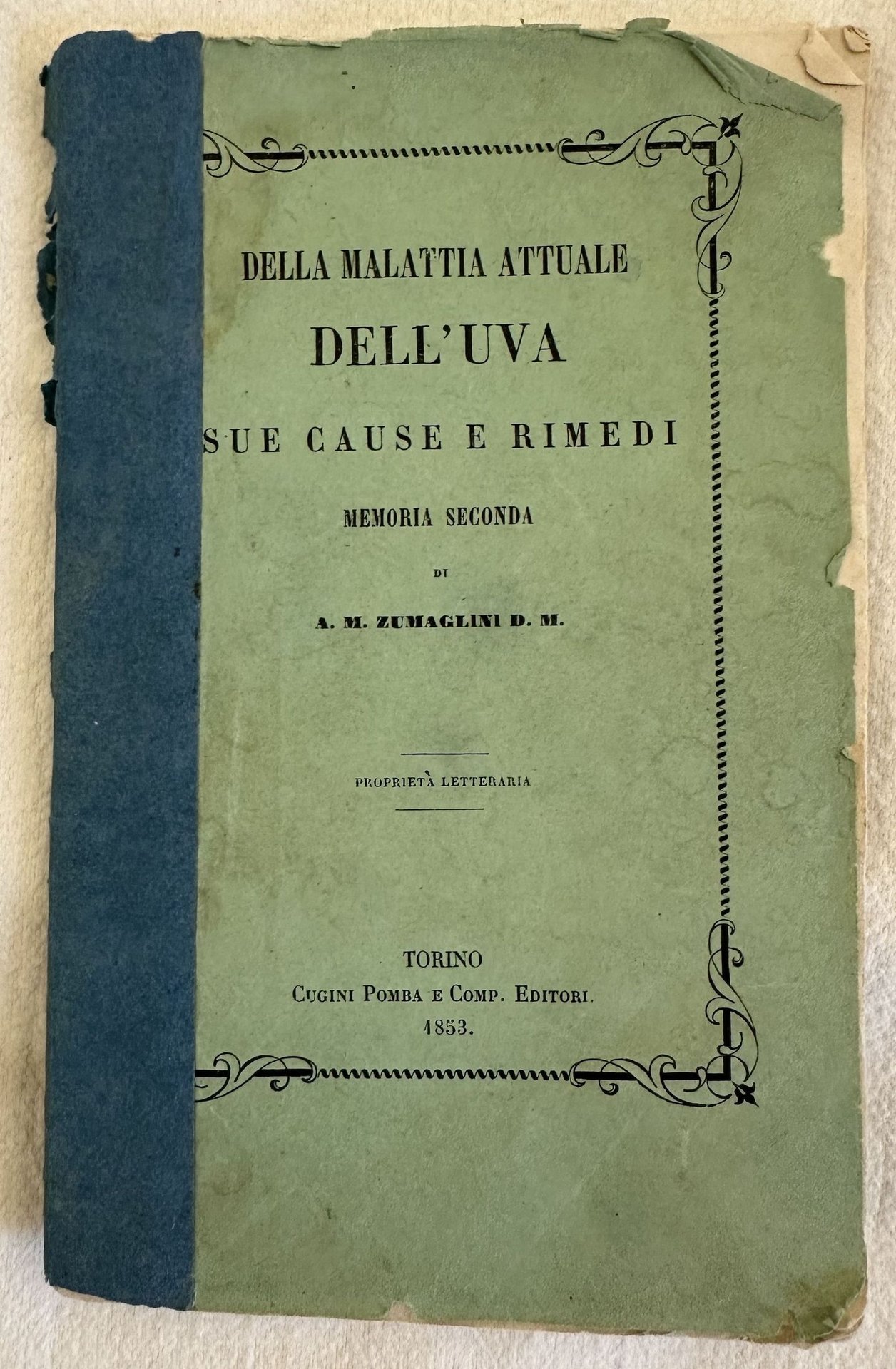 Edizione del 1853 di questo volume sulle malattie dell'uva a cura di Zumaglini. Alla fine sono presenti due tavole. All'interno: Antichità della malattia, andamento delle malattie, specie di uva ecc. In discrete condizioni. Copertina editoriale in discrete condizioni generali con lievi usure marginali. Dorso coperto da carta. Legatura in discrete condizioni con lievi rotture. Pagine in buone condizioni con fioriture. In 16. cm 17x11. Pp. 72.Edition of 1853 of this volume about the desases of grape by Zumaglini. At the end there are two plates. Inside: Antiquities of deseases, deseases, species of grape ecc. In fair conditions Editorial cover in fair general conditions lightly worn in the extremities. Spine is covered with paper. Binding in fair conditions with some cracks. Pages in good conditions with foxing. In 16. cm 17x11. Pp. 72.